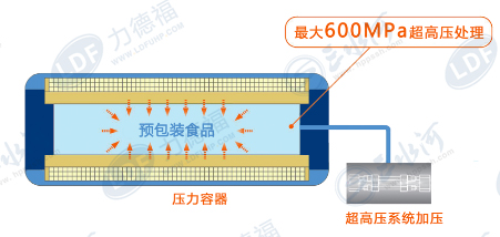 超高压力食品非热杀菌技术的工作原理是,运用超高压力可以破坏菌体蛋白中的非共价键,使蛋白质高级结构破坏,从而导致蛋白质凝固、淀粉等变性, 酶失活或激活,细菌等微生物被杀死,从而达到杀菌的目的。对维生素、色素和风味物质等低分子物质的共价键无明显影响,从而使食品较好地保持了原有的营养价值、色泽和天然风味。